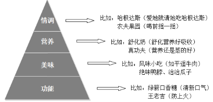 如上图所示,这可以说是马斯洛需求层次理论在食品行业中深度的实践版。从消费者需求层次层面来划分的话,食品的价值属性由低到高可归结为四类:功能、美味、营养和情调。