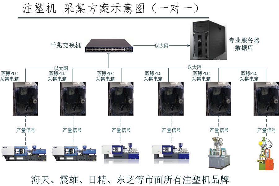 产量采集:通过注塑机PLC连接,通过无线网络数据采集器。