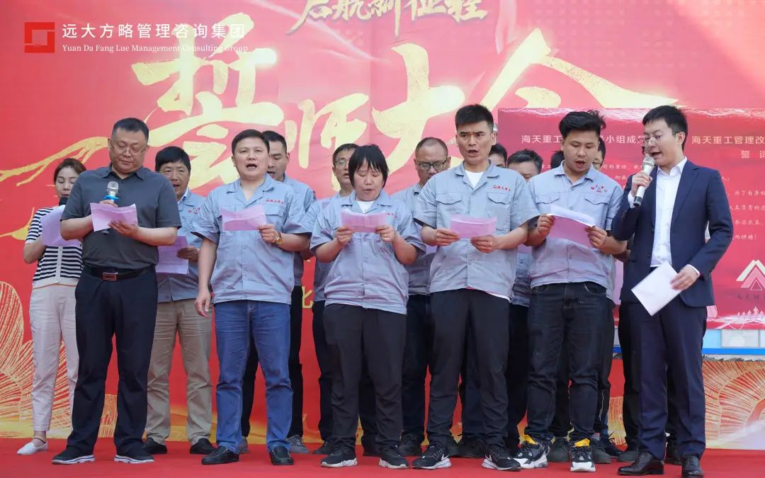 任正非说,产品发展的路标是客户需求导向,企业管理的目标是流程型组织建设。此次变革就是增强组织能力,提高企业的管理水平和竞争力,支撑公司战略目标的实现。针对变革,老师有方法和工具,但是需要大家一起携手将方案有效落地,推动此次变革的顺利进行。会上远大方略项目组老师也上台进行了宣誓,必将全力以赴做好此次海天重工的项目改善,助力企业更成功。