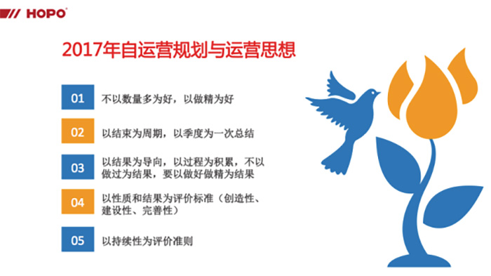 HOPO董事长李董对这季度的自运营进行了肯定的同时,并指出现有市场环境下的我们的一大优势是内部运营比对手强,我们如何持续的保持这优势?--需要我们全体员工的自运营,得提倡和发扬这种运营模式。