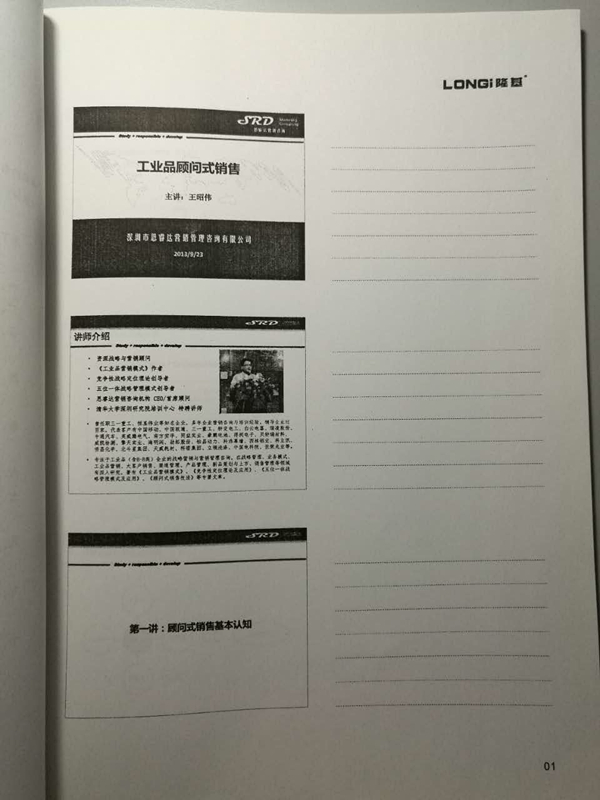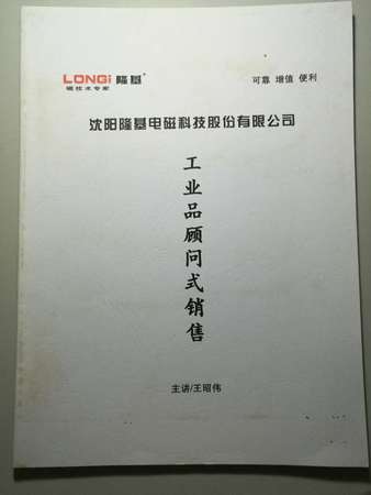 2013年10月7日,应沈阳隆基电磁科技股份有限公司领导邀请,为隆基电磁培训《工业品顾问式销售》,与隆基营销团队100余人交流分享了工业品销售相关技能。