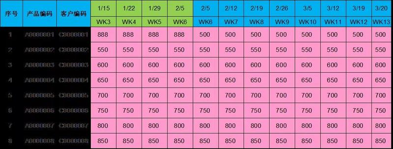 不同企业选择也不尽相同,客户需求稳定一般所采用的是前两者;一份Shipping plan报表,一般前面几周是正式PO订单模式,后面数周是FORECAST需求模式;以下是简易版SHIPPING PLAN,如截图2: