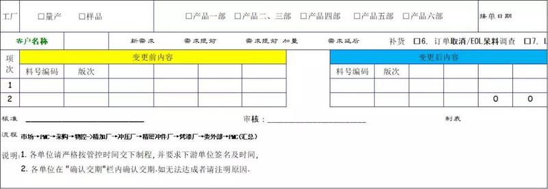 订单变更单一般由销售业务发起,PMC调查汇总;如果变更内容在周计划周期前,则需以补充计划形式发布,如果在周计划周期之后,则需更新SHIIPPING PLAN;订单变更单模版,如下截图4: