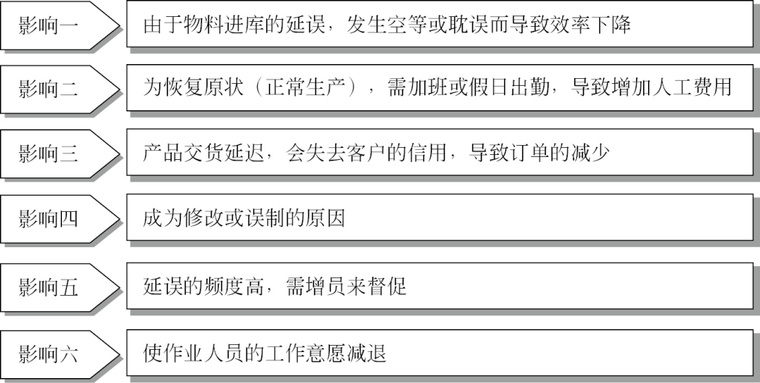有可能延迟交货的物料,应予早期发现,从而防止其发生,同时也应抑制无理由的提早交货。交期的延迟,毫无疑问会妨碍生产活动的顺利进行,对生产现场及其有关部门将带来有形、无形的不良影响(图1)。