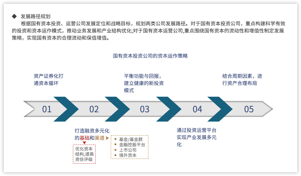 为了更好推动国有资本投资、运营公司,提升国有资本运营能力,远大方略认为,需要进一步明确国有资本投资、运营公司的定位,基于国有资本整体视角进行产业和业务的战略定位,并通过强化企业内部管理,提升国有资本的运营效率。