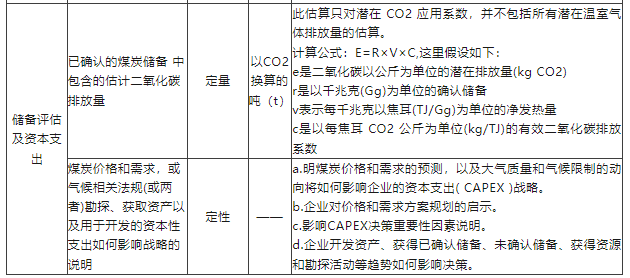 煤炭作业产业包括开采煤炭的企业和制造煤炭产品的企业,开采活动分为地下开采和露天开采,开采对象分为普通煤和原料煤。煤炭行业属于资源密集型,作业过程直接产生较多温室气体。该准则要求相关企业在温室效应煤烟排放方面对温室气体排放量进行直接披露,并对企业短期、长期的减排计划与目标按要求进行信息披露。对水资源的管理主要侧重于对水的循环利用、合规利用方面的披露。储备评估及资本支出方面侧重于对煤炭产业未来气候相关影响的预测。此外,针对煤炭行业的开采对象,该准则还要求对普通煤生产量(百万吨)和原料煤生产量(百万吨)进行披露。