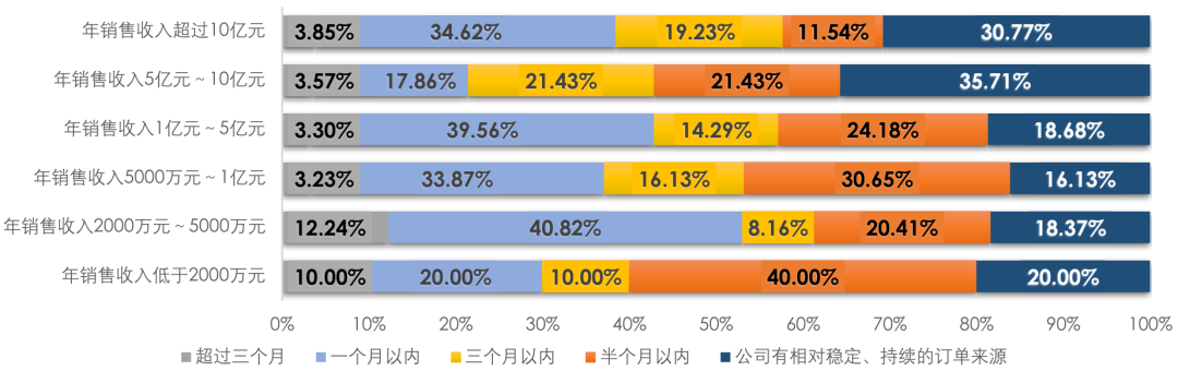 企业在手订单方面,26.4%的受访企业拥有相对稳定、持续的订单来源或在手订单能够支持三个月以上的生产,而34.4%的受访企业在手订单仅能够支撑企业一个月以内的生产。根据企业规模,大中型企业的在手订单更加稳定、充足,能够支持更长时间的生产;而小微企业的在手订单大多只能够支撑一个月以内甚至半个月以内的生产(图2)。
