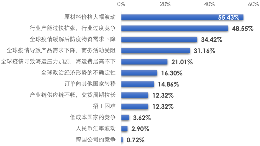 对于行业当前面临的主要外部挑战,受访企业反映的问题主要集中在原材料价格的大幅波动和行业产能的过快扩张,此外,防疫物资需求下降、商务活动受阻和海运费居高不下也是企业反映较多的问题(表4)。受访企业对来自低成本国家的竞争普遍持比较乐观的态度,企业对自身的产品质量、客户关系和创新能力有较强的信心,有信心和能力参与全球竞争。