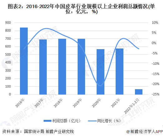 从利润总额来看,2016-2021年我国规模以上皮革、毛皮、羽毛及其制品和制鞋业整体利润总额呈现波动下降态势;2020年受新冠疫情影响同比下降21%;2021年,全行业规模以上企业的利润总额不超过600亿元,较2020年有小幅回升。2022年1-2月,全行业规模以上企业利润总额约69亿元,同比下降2.7%。