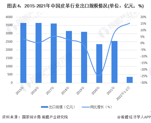 我国是全球皮革制造行业主要的生产地和出口地,2015-2018年,全国皮革出口规模逐年增长;2019年受到中美贸易摩擦的影响,有小幅下降;2020年受新冠疫情的影响,全国皮革行业出口总额同比下降超过20%;2021年皮革出口市场逐渐回温,全年皮革产品出口总额超过2500亿元,同比增长超过8%。