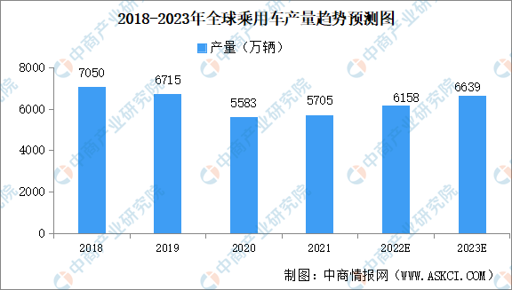 数据显示,2018年至2020年全球乘用车产量呈现下滑趋势,2021年随着新冠肺炎疫情缓和,居民出行需求增加,乘用车产量出现增长,产量约为5705万辆,同比增长2%。预计2022-2023年全球乘用车市场需求回暖加速,产量呈增长趋势,到2023年全球乘用车产量将达6639万辆。