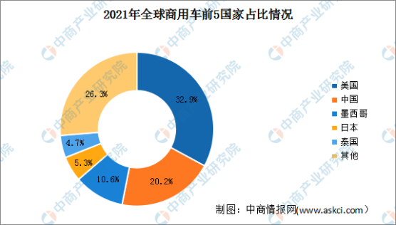 从国别来看,美国商用车产量占比最高,达32.9%;中国商用车产量全球第二,占世界总产量的20.2%。此外,墨西哥、日本和泰国,占比分别为10.6%、5.3%和4.7%。