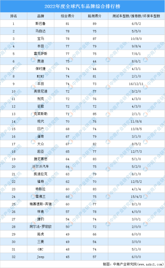2022年度全球汽车品牌综合排行榜基于道路测试、可靠性、客户满意度和安全性这四个因素对32个汽车品牌进行综合考察。榜单显示,斯巴鲁位居榜首,马自达和宝马排名第二和第三,本田、雷克萨斯、奥迪、保时捷、MINI、丰田、英菲尼迪进入前十,依次排名第4-10名。