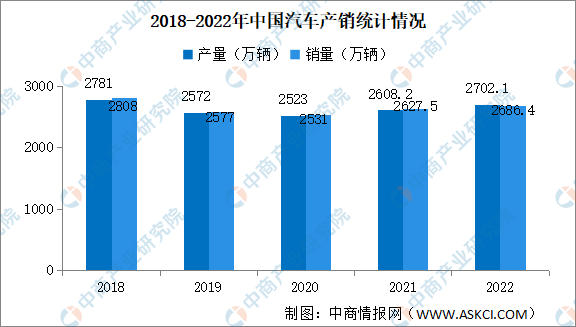 我国汽车产销总量已经连续14年稳居全球第一,2022年,尽管受疫情散发频发、芯片结构性短缺、动力电池原材料价格高位运行、局部地缘政治冲突等诸多不利因素冲击,但在购置税减半等一系列稳增长、促消费政策的有效拉动下,中国汽车市场在逆境下整体复苏向好,实现正增长,展现出强大的发展韧性。2022年,我国汽车产销分别完成2702.1万辆和2686.4万辆,同比分别增长3.4%和2.1%,与上年相比,产量增速持平,销量增速下降1.7个百分点。