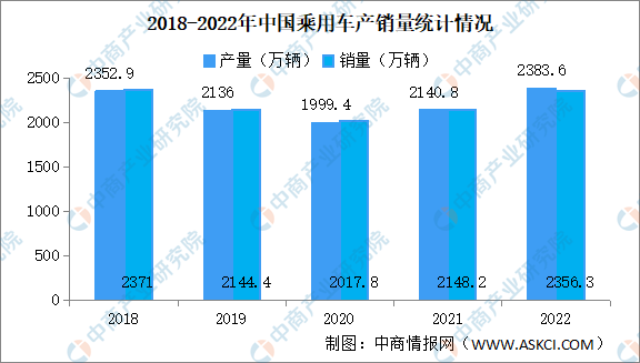 自2020年以来,我国乘用车市场实现连续增长。得益于购置税优惠和新能源快速增长,2022年国内乘用车市场销量呈"U型反转,涨幅明显。2022年,乘用车产销分别完成2383.6万辆和2356.3万辆,同比分别增长11.2%和9.5%,增速高于行业总体。