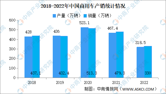 2022年全国商用车整体需求放缓,产销分别完成318.5万辆和330万辆,同比分别下降31.9%和31.2%,呈现两位数下滑,主要原因是前期环保和超载治理政策以及高位油价等因素的影响。
