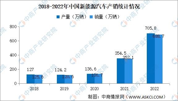 2022年12月,新能源汽车产销继续保持高速增长,再创历史新高,分别达到79.5万辆和81.4万辆,同比均增长51.8%。2022年,新能源汽车产销分别达到705.8万辆和688.7万辆,同比分别增长96.9%和93.4%。