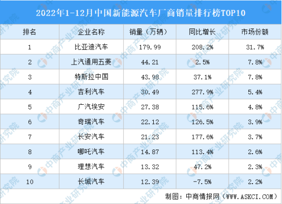 2022年1-12月,中国新能源汽车厂商销量前十车型销量合计409.98万辆。其中,比亚迪汽车销量最高达179.99万辆,市场份额31.7%。上汽通用五菱、特斯拉中国排名第二和第三,销量分别为44.21万辆、43.98万辆,市场份额均为7.8%。
