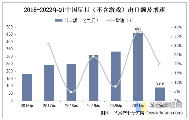 我国玩具产业重出口,工业化程度高但多以代工贴牌模式进行。根据中国玩具和婴童用品协会数据,2021年中国玩具(不含游戏)出口额达到461亿美元,同比增长37.6%。2022年一季度,中国玩具(不含游戏)累计出口额为89.9亿美元,较2021年同期增长19.4%