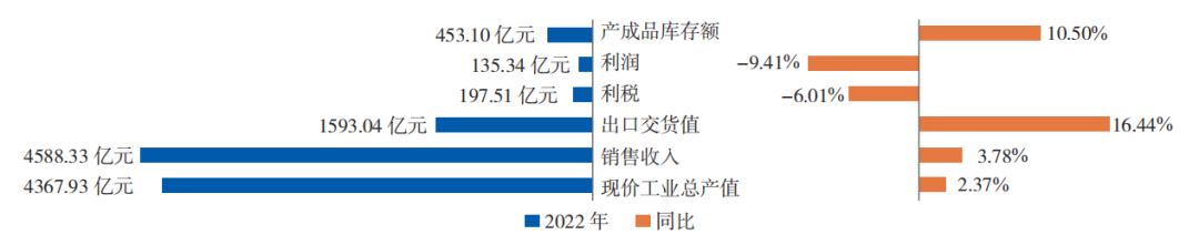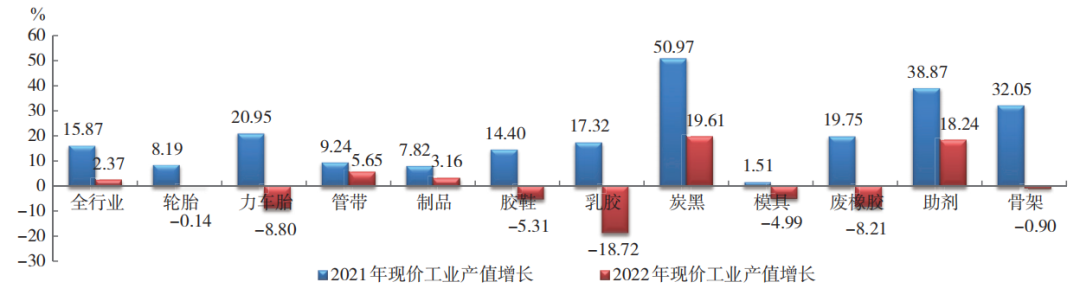 2022年,橡胶行业现价工业总产值增长2.37%,增幅减少13.50个百分点。