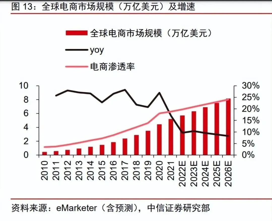 欧美电商市场发展成熟,高消费力支撑稳健基本盘。以北美市场为例,2021 年,美国电商用户达 2.1 亿,渗透率达 83.2%。尽管电商用户的渗透已较为充分,但居民整体消费能力领先。2021年,北美地区人均 GDP 达 5.9 万美元,是全球平均水平的 5.4 倍。同时,由于北美电商市场起步较早,物流、支付等基础设施均已建设完善。高价值用户及成熟的基础设施体系有力地支撑了北美电商行业的发展,根据 eMarketer,2026 年,北美电商市场规模有望达 1.8 万亿,2022-2026 年 CAGR 约 12%,在全球电商市场占比约 22%。
