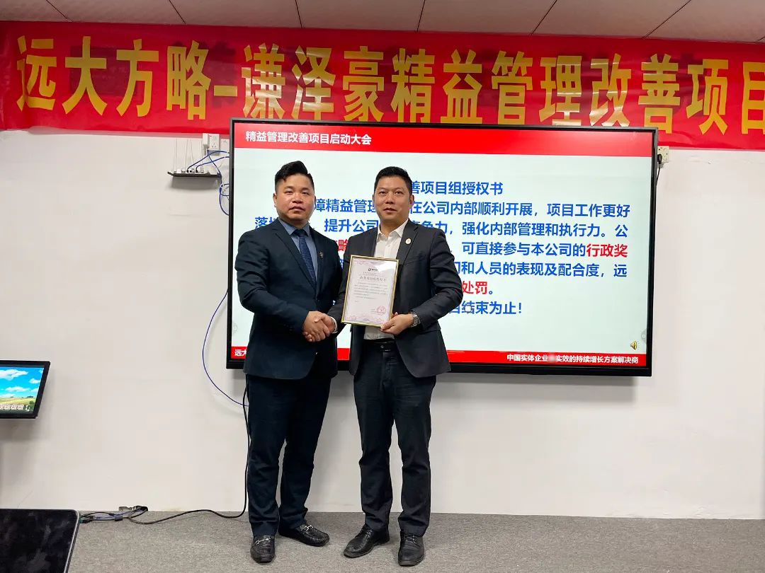 会上,万总为远大方略项目组颁发授权书,授予远大方略项目组对此次改善项目的管理权,同时为改善小组颁发军令状,为项目组成员颁发任命书,明确职责,强化责任,确保项目的有效落地。