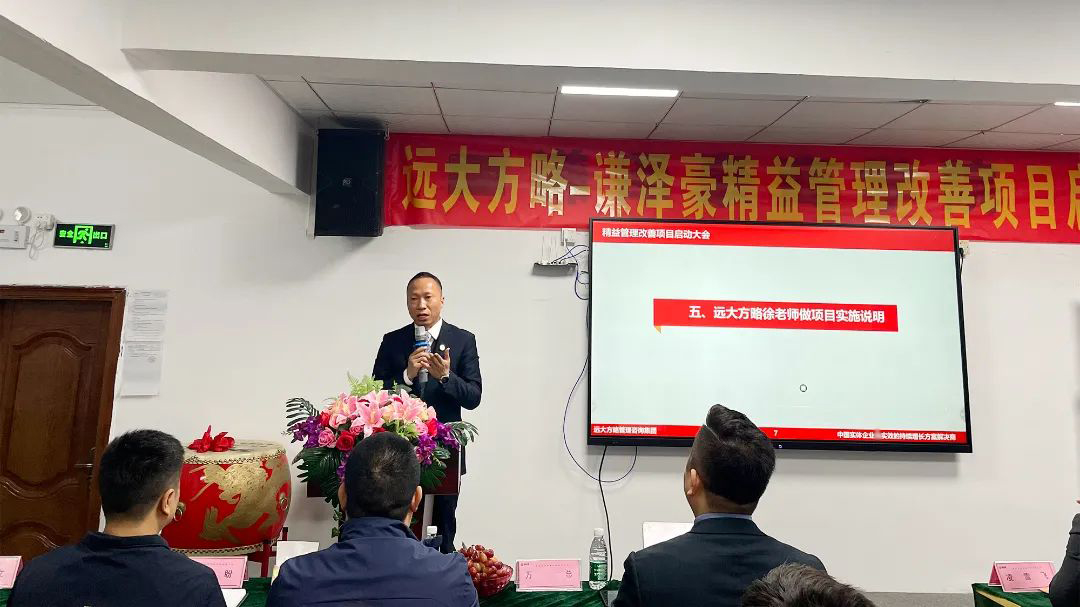 会议上,项目组老师首先向谦泽豪管理团队对远大方略的信任表示感谢,企业经营的本质是以客户为中心,围绕客户价值去建团队、建流程、搭体系,为客户创造更大价值才能留住客户,这也是此次企业开启项目的核心。远大方略项目总监强调了此次项目的两个重要思想,一是全员参与,所有部门所有员工都要参与此次改善;第二个就是要持续改善,从量变到质变,它有一个过程,需要我们持续做下去才会发生质的改变。