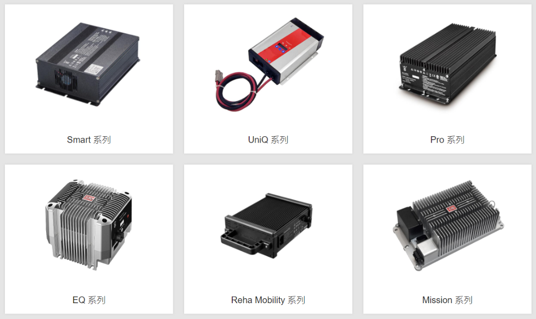 除此之外的主要标准品充电器有7大系列:Smart系列、UniQ系列、Pro系列、 EQ系列、Reha系列、Mission系列和N系列,全面覆盖工程机械、高空作业平台,环卫清洁车、洗地机、扫地机、AGV、机器人、轮椅、代步车、观光车、物流叉车、园艺护理设备、农用机械、机场地勤设备等领域以电池为动力的设备和低速车的充电。