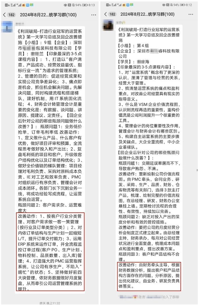 参加此次课程的学员近百人,来自不同行业不同企业的企业家、高管,更有部分企业组团前来学习,全员提升思维,助力企业增长。白天的高能课程让企业受益匪浅,结束一天的课程之后,企业老板都自发的带着自己的团队留下来进行深度复盘,盘点企业的关键节点和可优化空间,真正做到学以致用,落地见效。