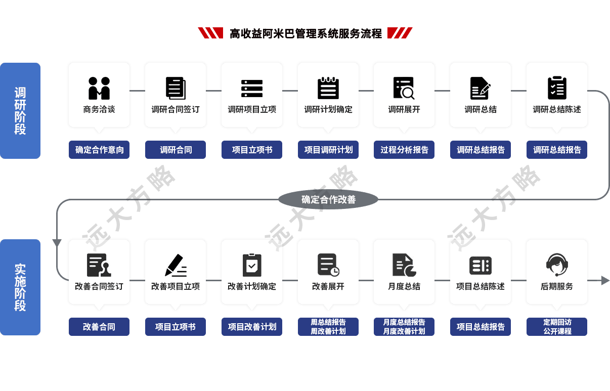 远大方略始终遵循不了解不理解企业的前提下绝不轻易下结论,正式制定改善方案前必须深入到业务一线了解和理解企业的运营情况。