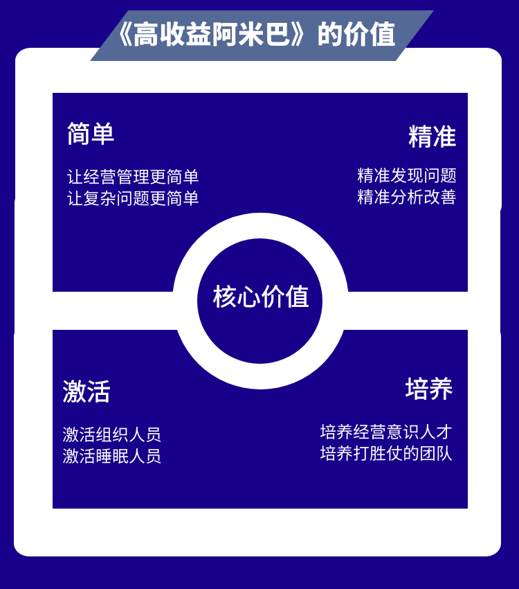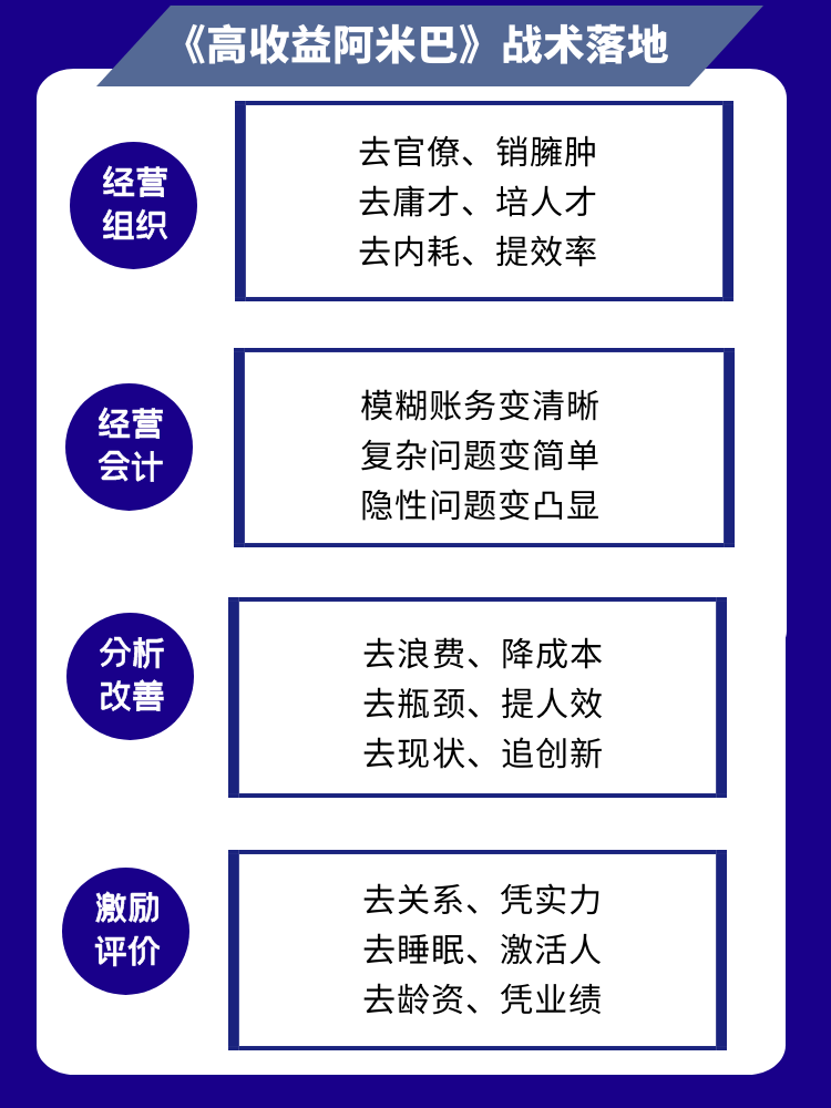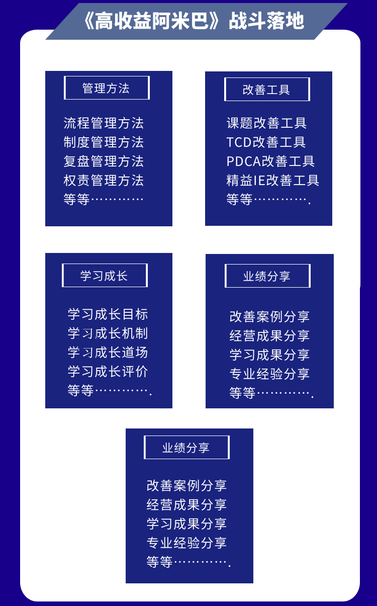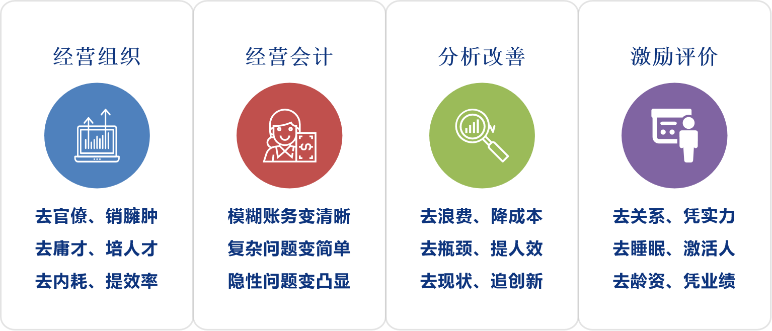 4、数据增长:(1) 公司高层、中层、基本价值观高度统一;(2)公司企业文化清晰明确,提倡什么、禁止什么清楚明了;(3)组织架构调整实施,责、权、利下放至各事业部;(4)事业部实现独立财务核算;(5)事业部内各阿米巴实现独立财务核算;(6) 人才培养机制初步形成;(7) 持续降低成本的自主运营机制初步建立;(8)公司利润率提升5%,净利润提升80%。